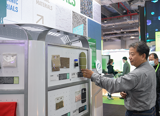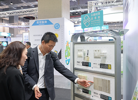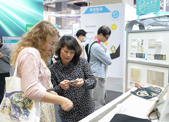 永續材質圖書館(SML)「行動模組與高值應用」,將永續成果化為可移動的展示單元。現場展示如何透過數位服務與跨產業媒合,像是半導體rPP晶圓盒再生料製作單一材質書寫筆;香蕉纖維、蚵殼粉、咖啡渣複合材料製作成纖維、紗線或布料;回收碳纖維再生料轉化為具市場競爭力的循環產品,透過展示模組可視化原料與後端應用,搭配永續材質圖書館官網做數位查詢,加深觀展者對材料來源、製程與應用潛力的理解,進一步促進設計端與產業端的連結,讓循環材料從展示走向實際應用,持續擴展其在市場中的價值與可能性。